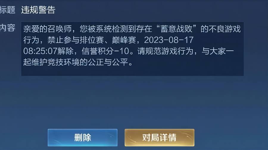上圖注意到了沒,當被系統監測到之后,存在「蓄意戰敗」行為的玩家,將被禁止參與排位和巔峰賽,同時還給出了一個截止日期,雙管齊下的同時,信譽積分還要被扣掉10分!